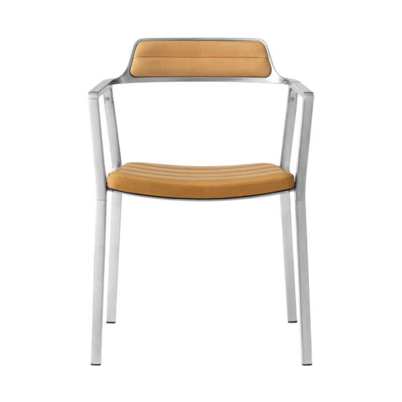 Der Stuhl von Vipp besteht aus pulverbeschichtetem Aluminium und ist entweder in Polyester, Wolle oder Leder erhältlich. Als Farben stehen je nach Materialauswahl Hellgrau, Dunkelgrau, Schwarz oder Cognac zur Auswahl.