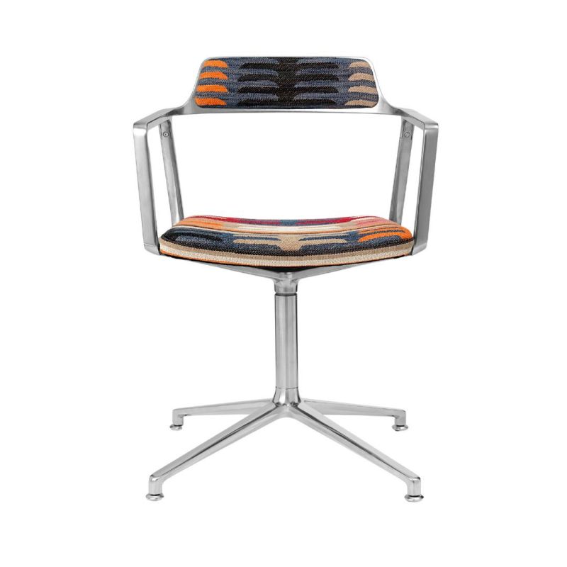 Diese Sonderedition des Vipp-Drehstuhls wurde für das Gästehaus Vipp Todos Santos in Mexiko entworfen und ist mit einem lebhaften Jacquardstoff des renommierten französischen Textilhauses Pierre Frey gepolstert. Die kräftigen Farben und reichen Texturen spiegeln den lebendigen Geist Mexikos wider, während die grafischen Bayadère-Streifen einen auffälligen Kontrast zum industriellen Aluminiumrahmen bilden.