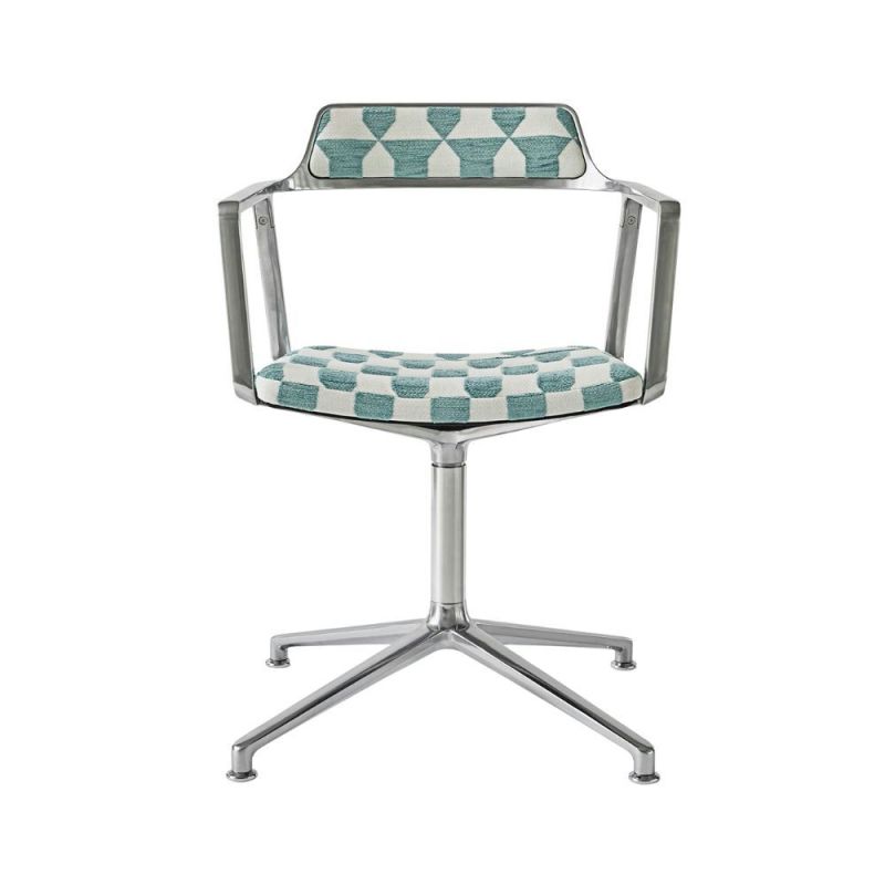 Diese Sonderedition des Vipp Drehstuhls ist mit einem markanten, zweifarbig gemusterten Stoff bezogen, der von einem mittelalterlichen Wappen inspiriert ist. Der für das Vipp Townhouse in Lagrasse entworfene Stuhl verbindet klassische Musterkunst mit modernem Komfort. Das historische Motiv wurde ursprünglich vom renommierten französischen Textilhaus Maison Le Manach entworfen und von Pierre Freys Werkstätten in Nordfrankreich neu interpretiert.