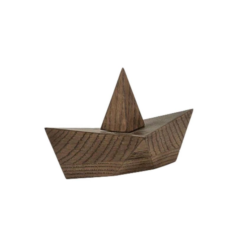 Admiral, das Papierschiffchen aus Holz. Eine Hommage an die kreative Papierschiffchen der Boyhood, hier interpretiert in massivem, geräuchertem Eichenholz. Ausgestattet mit einem versteckten Magneten, der das Segel an Ort und Stelle hält - ein elegantes Designobjekt mit nostalgischem Charme.