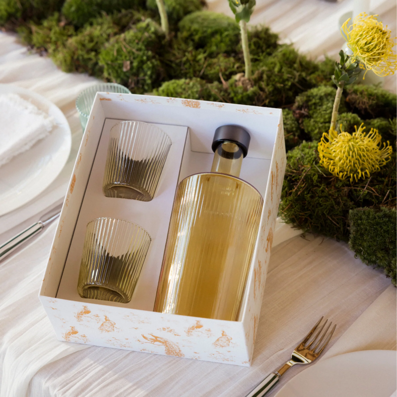 Oplev det elegante Gift Set bestående af én raffineret flaske og to stilfulde glas, smukt præsenteret i en eksklusiv gaveæske. Den perfekte gave til én, du holder af.