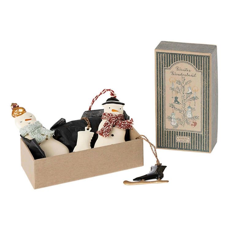 Diese elegante Geschenkbox enthält 4 wunderschöne Maileg-Ornamente: einen Schneemann, seine Frau und 2 Schlittschuhe. Jedes Ornament wird sorgfältig in Seidenpapier eingewickelt und in einer Schachtel präsentiert, die mit den Kunstwerken von Dorthe Mailil verziert ist.