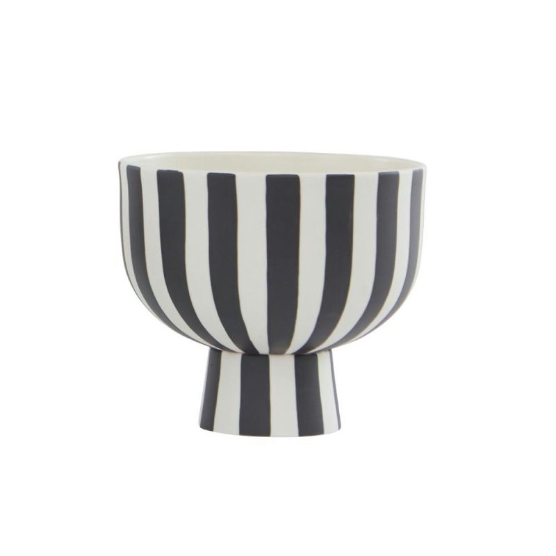 "Die Toppu Schale zeichnet sich durch ein grafisches und stilreines Design aus, das der Einrichtung einen dekorativen und modernen Ausdruck verleiht. Die Schale kann als Übertopf verwendet werden, ist aber auch lebensmittelecht und eignet sich daher perfekt zum Servieren von Obst und Ähnlichem. Die Schale ist handgefertigt aus 100% Steinzeug, was jedem Produkt eine einzigartige Note verleiht."