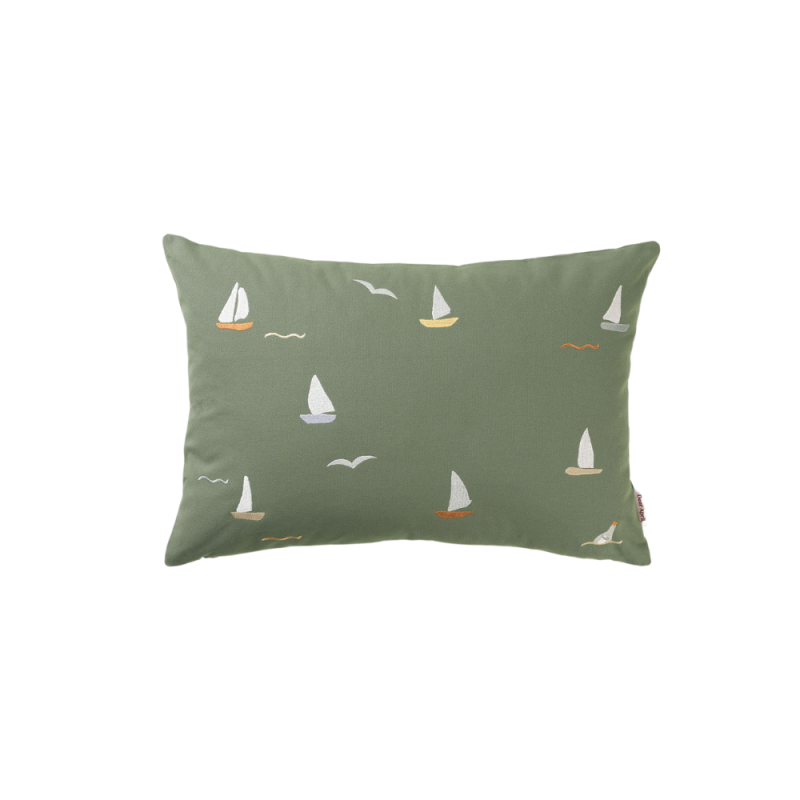 Dekoratives Kissen in einem schönen, tiefgrünen Farbton mit Stickereien, inspiriert vom Leben am Meer. Das Kissen besteht aus robustem Canvas mit feinen Bootsmotiven in schön abgestimmten Farben und einer unifarbenen Rückseite.