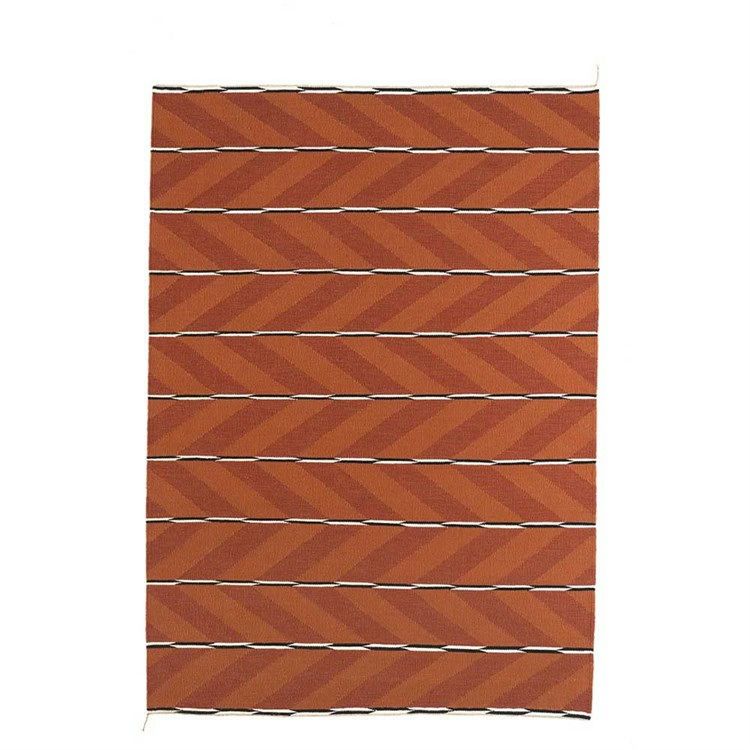 Die Vibeke Klint-Teppiche von Nordic Modern sind handgewebt und in vielen schönen Variationen, Farben und Webarten erhältlich. Der Teppich VK6 hat eines der für Vibeke Klint typischen Zickzackmuster mit Blitzdetails, die in Flachwebtechnik gewebt sind, was dem Teppich einen schönen und hübschen Ausdruck verleiht. Der Teppich ist in kräftigen, warmen Rot-/Orangetönen mit schönen Details in Schwarz und Weiß erhältlich.