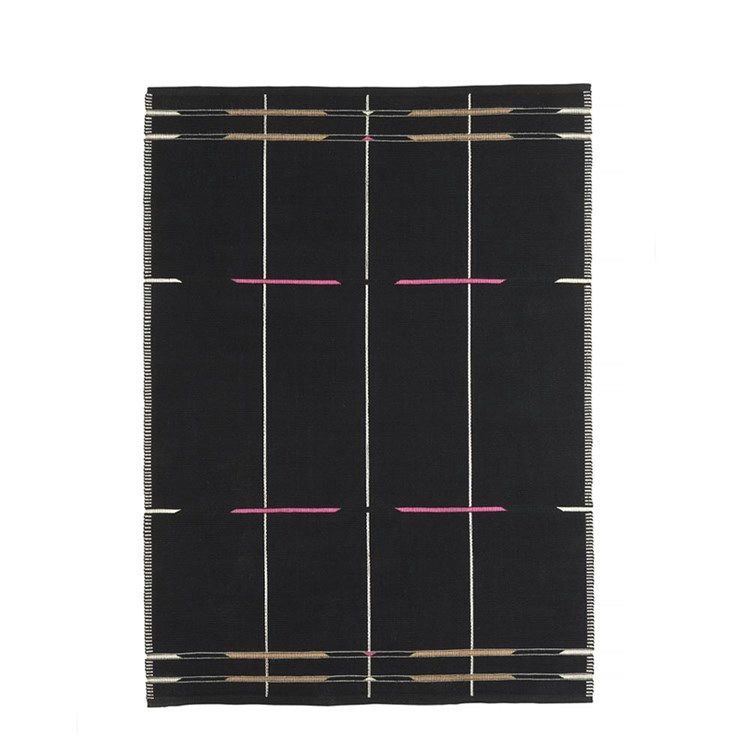 Der Teppich ist mit einem wunderschönen tiefschwarzen Grundton und eleganten Details in Weiß, Rosa und Beige gewebt. Verwenden Sie den Teppich im Wohnzimmer, Arbeitszimmer oder Esszimmer, um etwas Platz und Wärme in den Innenräumen zu schaffen.
