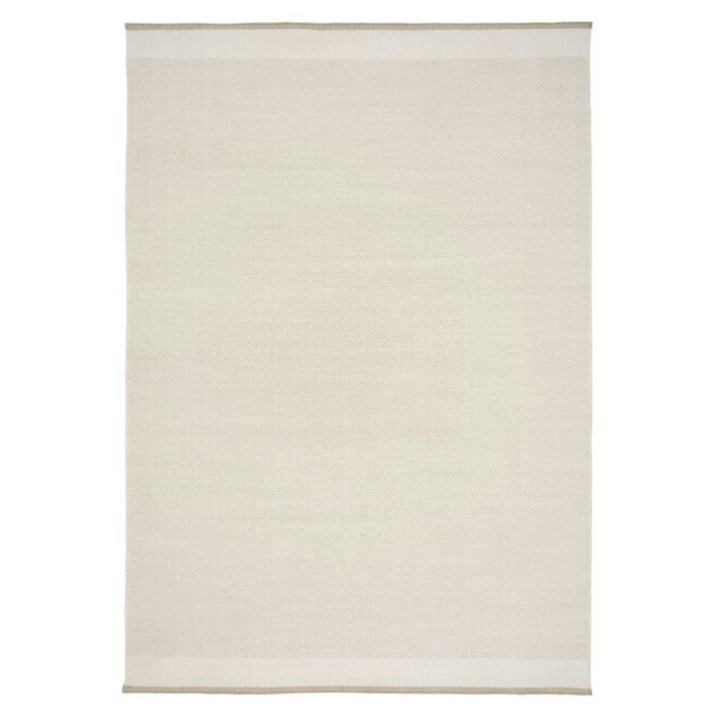 Stratum Echo. Neutrale Töne und ein Fischgrätenmuster erzeugen einen dynamischen und dennoch harmonischen Ausdruck, eingerahmt von kontrastierenden Kanten. Der Teppich ist aus strapazierfähigem Wollgarn mit Leinenkette gewebt und bietet Wärme, Komfort und ein natürliches, rustikales Aussehen.