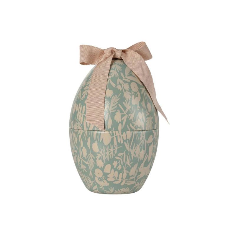 Metallische Ostereier-Ornamente mit einem wunderschönen neuen Aufdruck. Schauen Sie sich den Aufdruck genauer an und versuchen Sie, die verschiedenen Tiere zu entdecken. Das Ei hat oben eine große, weiche Schleife, die dem Ei ein exklusives Aussehen verleiht.