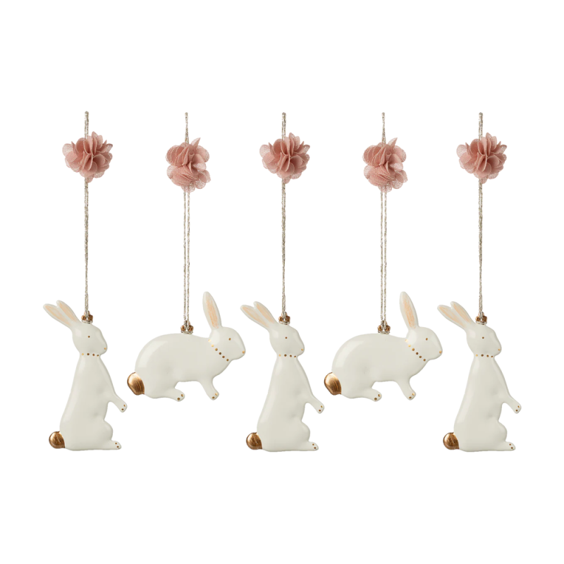 Osterhasen-Ornamente aus Metall mit handbemalten Details und einem weichen Pompon am goldenen Band. Hängen Sie sie dekorativ an einen Zweig oder verwenden Sie sie als Schmuck auf dem Ostertisch. Kombinieren und erweitern Sie Ihre Sammlung mit weiteren Maileg-Osterornamenten.