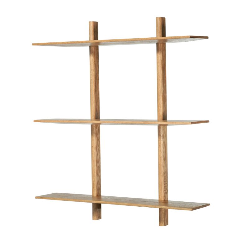 Muubs Noir Regal. Elegantes Regalsystem aus Eiche mit 3 Regalböden und unterschnittenen Kanten, die einen exklusiven, handgefertigten Look verleihen. Ideal für Küche, Wohnzimmer oder Büro, verwenden Sie es für Geschirr, Dekorationen oder Bücher. Jeder Boden ist mit bis zu 5 kg belastbar. Ein stilvolles und funktionales Wandregalsystem für das gesamte Zuhause.