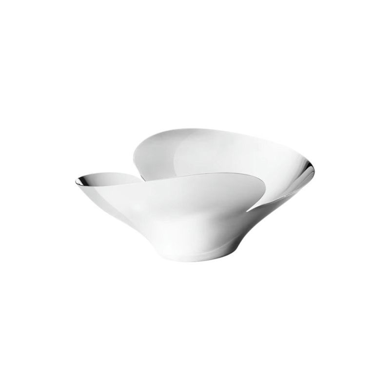 Diese Schale stammt aus der beliebten Bloom-Kollektion, die von der dänischen Keramikerin Helle Damkjær entworfen wurde. Die Schale trägt die organischen Signaturformen der Serie, inspiriert von einer Blume, die erblüht, und sie ist aus hochpoliertem Edelstahl gefertigt. Ein skulpturales Designstück für den Alltag, das sowohl für sich als auch als Obstschale schön ist.