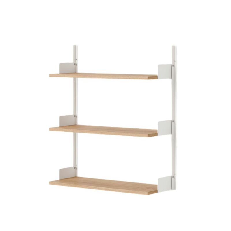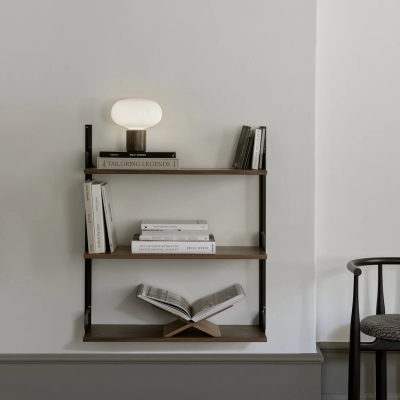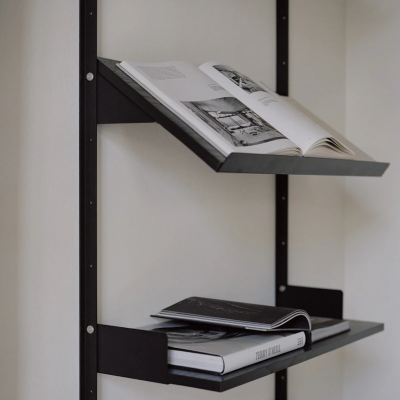 Das Regalsystem von New Works ist ein schlichtes und flexibles Wandregal mit einem zeitlosen, zurückhaltenden Ausdruck. Das Design ist bis ins kleinste Detail durchdacht von den kantigen Wandschienen bis hin zu den integrierten Buchstützen und flachen Rändelschrauben aus Edelstahl.
