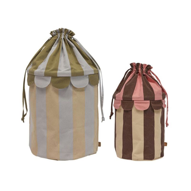 Saga Baskets kombinieren praktische Aufbewahrung mit verspieltem Design. Inspiriert von klassischen Zirkuszelten verleihen diese Textilkörbe dem Kinderzimmer Farbe und Charme, während Spielzeug, Kleidung und andere Alltagsdinge ordentlich verstaut bleiben.