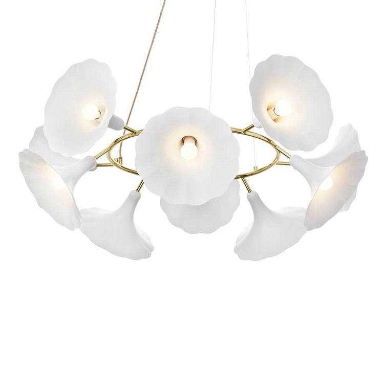 10 blumenförmige Schirme aus weißem Metall schweben elegant auf einem polierten Messingring und erzeugen einen romantischen Ausdruck.