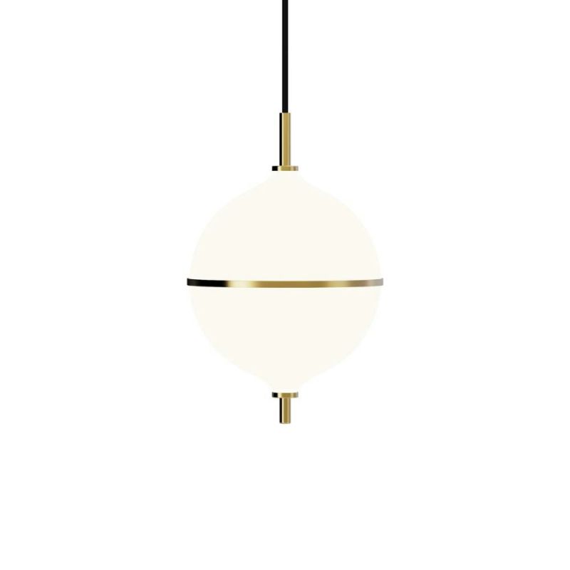 Tidlös elegante, minimalistische Globus-Hängeleuchte. Ein Anhänger mit schlichtem und zugleich raffiniertem Ausdruck. Die Kuppel aus mattiertem Opalglas ist elegant ausbalanciert und durch ein feines Metalldetail unterteilt, wodurch ein harmonischer Kontrast zwischen dem weichen Licht und der warmen Messingoberfläche entsteht. Eine stilvolle Wahl für moderne und klassische Räume.