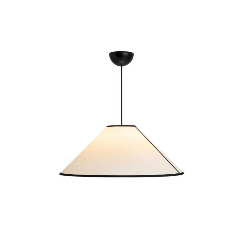 Ava Cone Pendelleuchte entworfen von Ana Kra für HAY. Moderne Interpretation der klassischen Empire-Pendelleuchte mit einem kegelförmigen, semitransparenten Schirm aus ECOPET (recyceltem PET-Kunststoff) und kontrastierendem Stoffrand. Die Lampe bietet weiches, stimmungsvolles Licht und passt perfekt in Schlafzimmer, Flure, Wohnzimmer und Esszimmer. Wird mit HAY Common Cord Set geliefert und verwendet austauschbare, dimmbare LED-Birne.