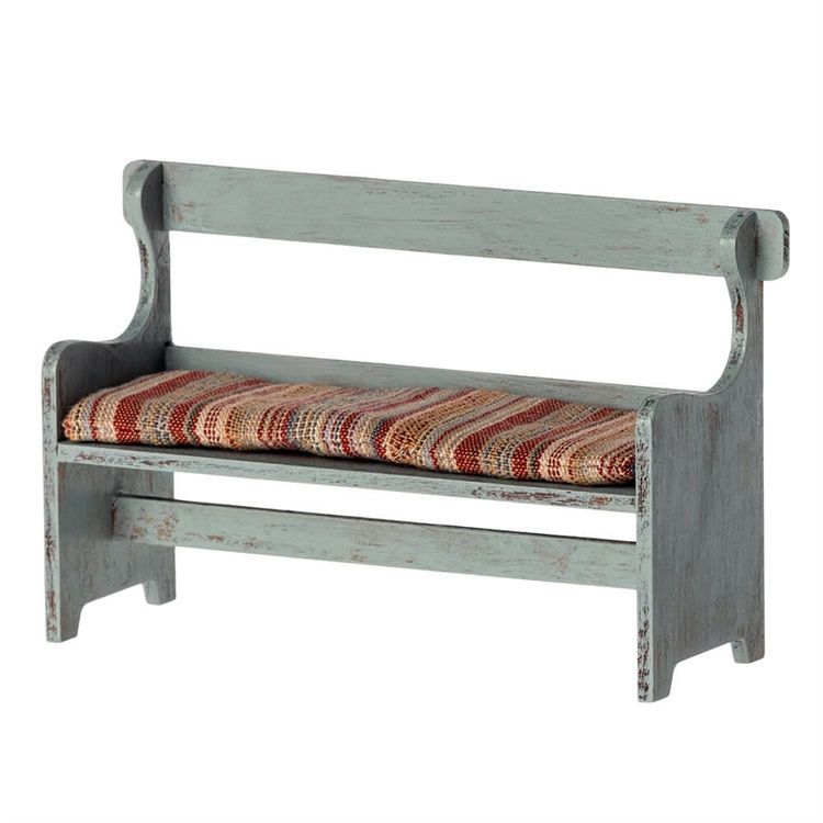Eine charmante Holzbank für die Mäusefamilie, mit einem einzigartigen handbemalten Vintage-Look. Jede Bank ist einzigartig und Variationen in der Farbe verleihen ihr Charakter. Ein weiches Kissen sorgt für Komfort für kleine Mäuse.