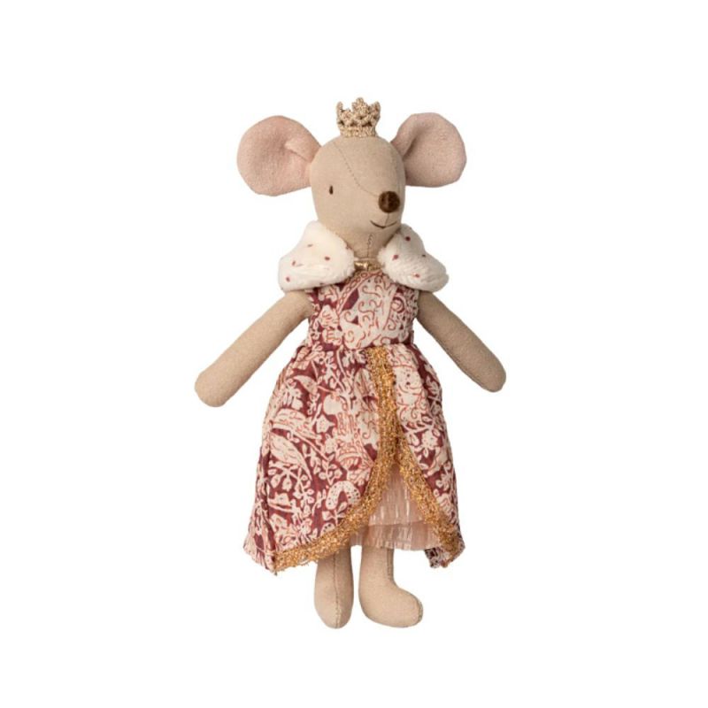Die Königin-Maus in Größe Mutter ist bereit, Gastgeberin auf ihrem Schloss zu sein. Sie trägt ein schönes königliches Kleid und eine Krone und passt perfekt in den Schlossaal.