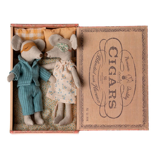 Mutter und Vater Maus von Maileg sind bereit für die Nacht in ihren schönen Schlafanzügen und Schlafmasken. Die Zigarrenkiste ist ein gemütliches Bett, das süße Träume sichert. Mit variierenden Bettwäschefarben wird jedes Set einzigartig und charmant.