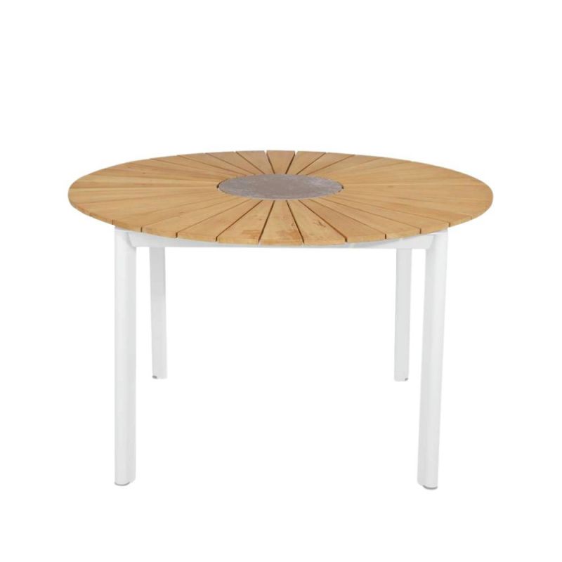 Der Mindo 101 Esstisch in einer gemütlichen runden Form ist perfekt für kleinere Terrassen. Der Tisch verfügt über eine Teak-Tischplatte mit einer keramischen Mitte, wodurch er ideal für heiße Gegenstände ist. Das pulverbeschichtete Aluminiumgestell erfordert nur minimalen Pflegeaufwand, was den Tisch sowohl praktisch als auch stilvoll für den Außenbereich macht.