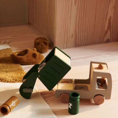 Abfall-LKW aus massivem Holz für lustige und entwicklungsfördernde Spielzeit. Hat vier Sortierbehälter mit verschiedenen Recyclingsymbolen und mehrere überraschende, interaktive Details, die es Ihrem Kind ermöglichen, alleine oder mit Freunden und Familie zu erkunden und zu spielen.
