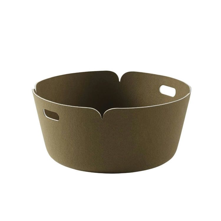 Der Aufbewahrungskorb Restore von Muuto in der eleganten runden Version wurde 2009 von Mika Tolvanen entworfen, mit dem Ziel, ein nachhaltiges und stilvolles Produkt zu schaffen, das die Aufbewahrung einfach und ordentlich aussehen lässt. Der Korb besteht aus Filz, der aus recycelten Plastikflaschen gewonnen wird. Dadurch entsteht ein nachhaltiges Produkt, das mit seiner weichen und gefilzten Optik dem Innenraum Wärme und Tiefe verleiht.