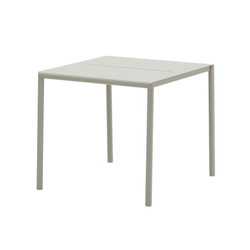 Mai-Serie. Outdoormöbel aus pulverbeschichtetem Stahl für Garten, Terrasse und Balkon. Die Serie besteht aus stapelbaren Stühlen mit und ohne Armlehnen sowie Tischen in zwei Größen, die alle aufeinander abgestimmt sind. Der monochrome Look ist schlicht und elegant, während die gebogene Stahlplatte und der robuste Rahmen sowohl Stabilität als auch Komfort gewährleisten. Ein diskreter Schlitz im Sitz sorgt für Wasserablauf und Leichtigkeit, ein Designmerkmal, das sich durch die gesamte Serie zieht und den Ausdruck zusammenhält.