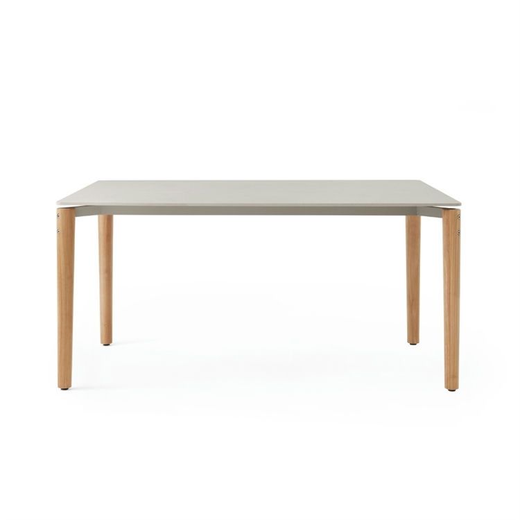 Der Vipp Open-Air-Esstisch ist in zwei Größen erhältlich und besteht aus einem Aluminiumrahmen mit einer 12 mm starken Keramiktischplatte. Die Beine sind konisch und aus Teakholz gefertigt. Unter jedem Bein befinden sich kleine Stellfüße, mit denen Sie die Höhe des Tisches je nach Untergrund anpassen können.