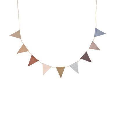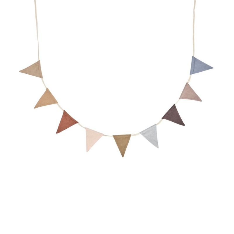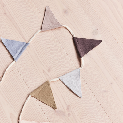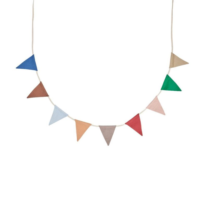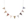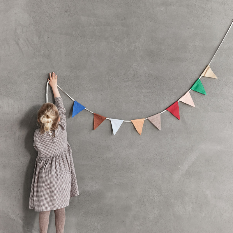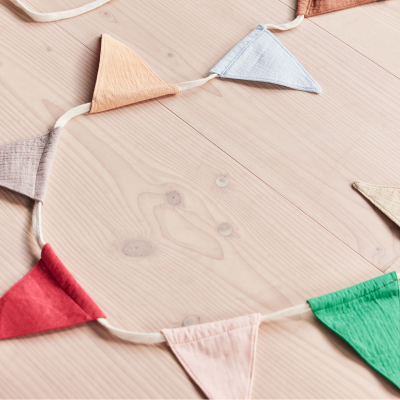 Unsere Festive Moni Girlande wird mit Sorgfalt gefertigt und besteht aus einer Reihe von Dreiecken aus weichem und leichtem Musselin in schönen, verspielten Farben. Jedes Dreieck ist sorgfältig genäht, um einen schönen und dekorativen Ausdruck zu schaffen, der dem Raum eine gemütliche und festliche Stimmung verleiht. Perfekt fürs Kinderzimmer oder als Dekoration für besondere Anlässe.
