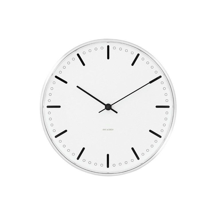 Die City Hall-Wanduhr von Arne Jacobsen ist in den Größen Ø16,5 cm, Ø21 cm oder Ø29 cm erhältlich, besteht aus Aluminium und verleiht an der Wand hängend einen eleganten und schwebenden Look.