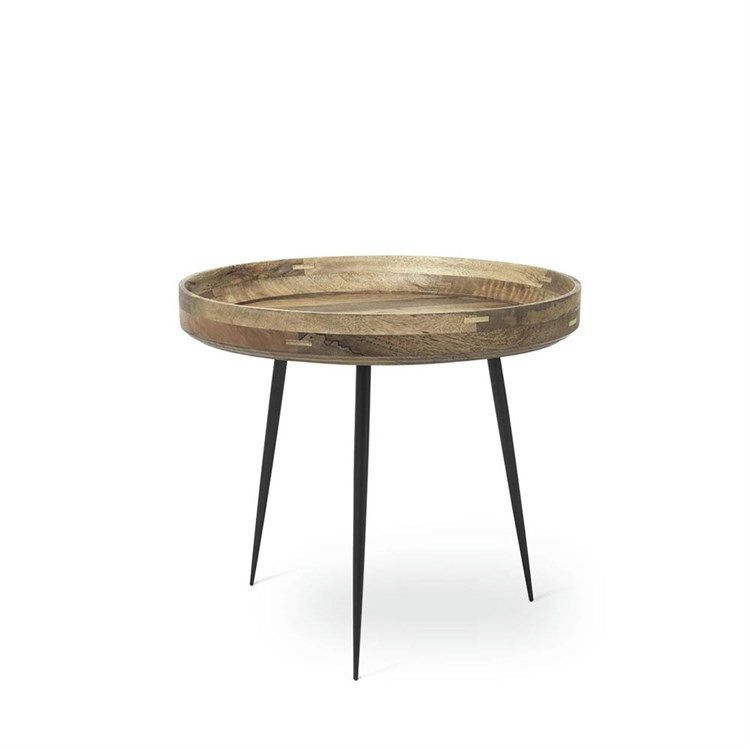Der Bowl Coffee Table von Mater in wunderschönen und dekorativen Varianten, mit einer Tischplatte aus nachhaltigem, gedrechseltem Mangoholz, kombiniert mit drei Beinen aus wahlweise schwarzem Stahl.