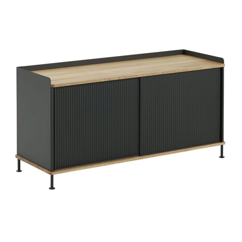 Das Enfold-Sideboard kombiniert Industriematerialien mit Wohnbezügen und bietet einen neuen Ansatz für moderne Aufbewahrung. Es besteht aus lackiertem Stahl, der elegant eine Ober- und Unterseite aus massiver Eiche umschließt und so einen einzigartigen Kontrast zwischen kalten und warmen Materialien schafft. Die geriffelten Stahltüren verleihen ein modernes Aussehen.