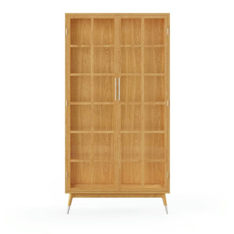 Das fein bearbeitete massive Holz mit den dekorativen Beinen aus gebürstetem Stahl und dem klaren Glas an den Seiten und der Vorderseite, verleiht der Vitrine ein leichtes und elegantes Aussehen.