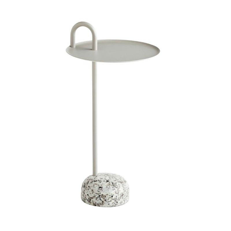 Der Bowler Table von Shane Schneck ist ein kompakter Beistelltisch, perfekt für kleine Räume. Es verfügt über ein charakteristisches Rohr, das gleichzeitig als Griff dient. Der Tisch besteht aus pulverbeschichtetem Stahl mit einem schweren Granitsockel, der für Stabilität sorgt und dennoch leicht zu bewegen ist. Es wird flach verpackt geliefert und lässt sich leicht zusammenbauen, ideal für Zuhause und das Büro.