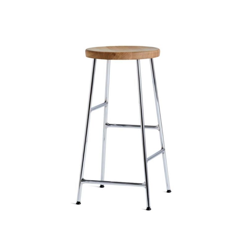 Cornet Barhocker. Eleganter Barhocker mit Sitzfläche aus massiver Eiche und schlankem Rahmen, inspiriert von Fahrradständern. Erhältlich in zwei Höhen, mit mehreren Holz- und Gestellvarianten in Chrom oder Pulverbeschichtung. Ideal für eine Bar, eine Kücheninsel oder einen Arbeitsplatz, sowohl privat als auch öffentlich.