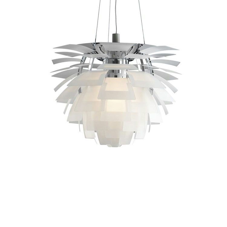 Die Artichoke-Leuchte von Louis Poulsen ist ursprünglich ein Entwurf von Poul Henningsen aus dem Jahr 1927, wurde dann aber 2008 in einer wunderschönen Glasversion auf den Markt gebracht. Die Leuchte ist Teil der Cone-Familie, die in vielen schönen Varianten und Größen erhältlich ist, und besteht aus sandgestrahltem Glas, das aus insgesamt 72 abgewinkelten Blättern besteht, die in 12 Reihen aufgeteilt sind und für ein schönes und gut geworfenes Licht sorgen.