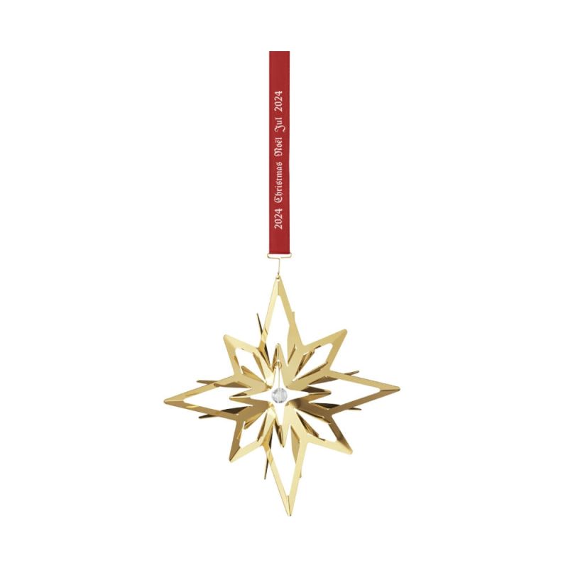 Im Jahr 2024 ist Georg Jensens Weihnachtswecker ein leuchtender Stern, entworfen von Sanne Lund Traberg. Er hängt an einem wunderschönen roten Band und in der Mitte des Sterns funkelt eine Zirkoniakugel. Das Uhrwerk ist mit 18 Karat Gold beschichtet und das Design ist von einem funkelnden Sternenhimmel in einer Winternacht inspiriert. Im Lieferumfang enthalten ist ein rotes Band mit der Jahreszahl 2024 sowie ein blaues Band, das das Thema der Weihnachtskollektion symbolisiert: eine sternenklare Winternacht.