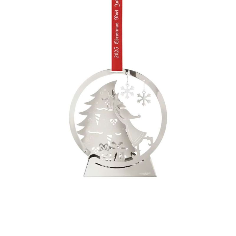 Das diesjährige Weihnachtsmobile aus der Weihnachtskollektion 2025 von Georg Jensen zeigt eine Schneekugel mit einem Mädchen, das den Stern auf einen funkelnden Weihnachtsbaum setzt - ein Motiv voller Wärme und Weihnachtsstimmung. Das Mobile ist aus Messing gefertigt und mit 18 Karat Gold überzogen. Es ist Teil der traditionellen Sammlerserie, die jedes Jahr ein neues, stimmungsvolles Design präsentiert. Zwei Bänder sind im Lieferumfang enthalten: ein klassisches rotes Weihnachtsband und eines in der diesjährigen Kollektionsfarbe Burgunderrot.