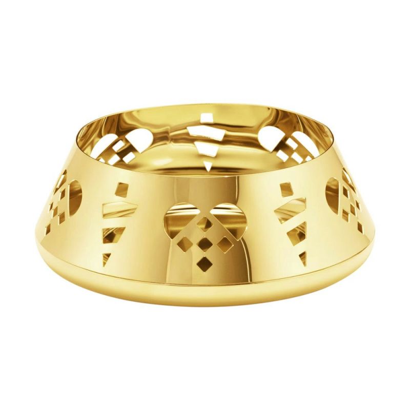 Dieser funkelnde Kerzenständer, mit 18 Karat Gold überzogen, passt perfekt zu Stumpenkerzen und hebt elegant den warmen Schein des lebendigen Lichts hervor. Das Design ist inspiriert von klassischen dänischen Weihnachtsmotiven, und der Kerzenständer hat wunderschöne Schnitzereien von geflochtenen Weihnachtsherzen und -tüten, die eine gemütliche Atmosphäre in Ihrem Zuhause schaffen.