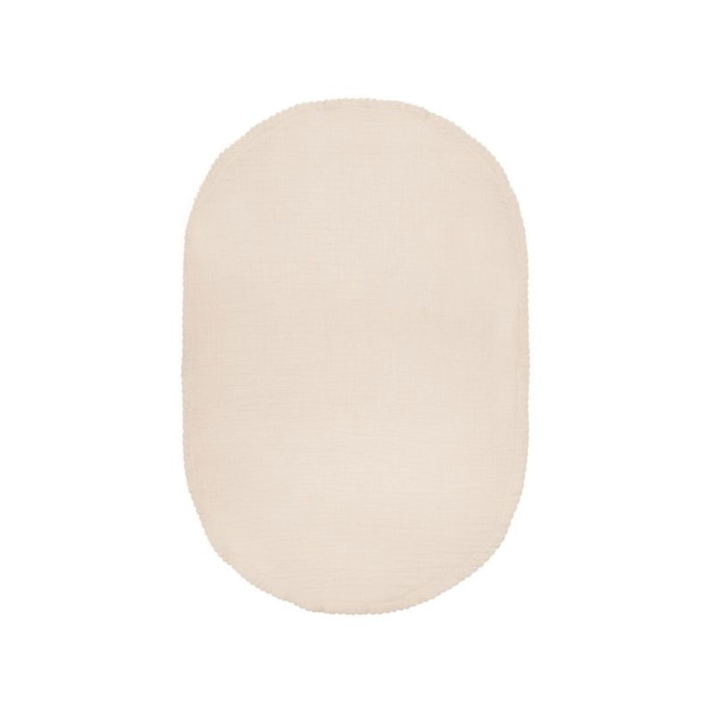 2 Stk. Ovale Wendewickelauflagen mit elegantem Spitzenrand, die in Form und Größe perfekt zu unserer Wickelauflage KAI passen. Sie dienen als zusätzlicher Schutz bei kleinen Unfällen. Die Farbe ist Creme, was sowohl zu unserer KAI-Möbelkollektion als auch zu unseren anderen Textilien passt. Die Matten bestehen aus zertifiziertem Bio-Baumwollmusselin. Mit ihren vier Lagen sind sie extra dick und weich und dadurch besonders saugfähig und angenehm in der Anwendung.