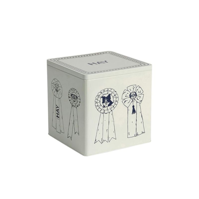 Et designsamarbejde mellem Mette Hay og hendes ven Barbara Maj Husted Werner, grundlægger af Holly Golightly en tidligere butik med kurateret mode og interiør HAY Dogs inviterer hundeejere og deres kæledyr ind i HAY-universet med funktionelle og farverige accessories. Med en legende, hundeinspireret form kombineret med praktisk opbevaring holder HAY Dogs Food Storage Tin tørfoder frisk, samtidig med at den fungerer som et dekorativt element på køkkenhylderne.