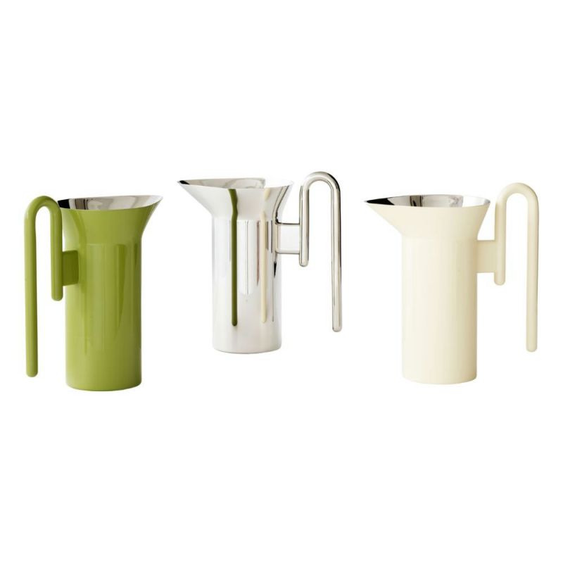 Der Momento-Krug ist das Ergebnis jahrelanger Produktforschung zur Entwicklung eines tropffreien Behälters mit perfekter Ausgießform. Erhältlich in zwei Varianten: polierter Edelstahl und Elfenbein, und mit einem Fassungsvermögen von bis zu 1 Liter Flüssigkeit.