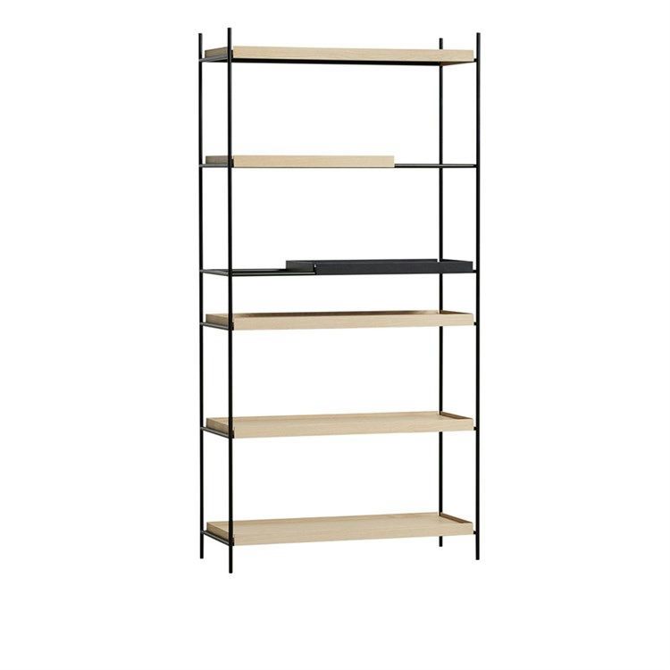 Das Tray Shelf von Woud, entworfen von Hanne Willmann, ist in vielen dekorativen und spannenden Kombinationen erhältlich. Das Regal ist sowohl in einer hohen als auch in einer niedrigen Version erhältlich, hier sehen Sie jedoch die hohe Version mit insgesamt 6 Regalböden, 2 kurzen und 4 langen.