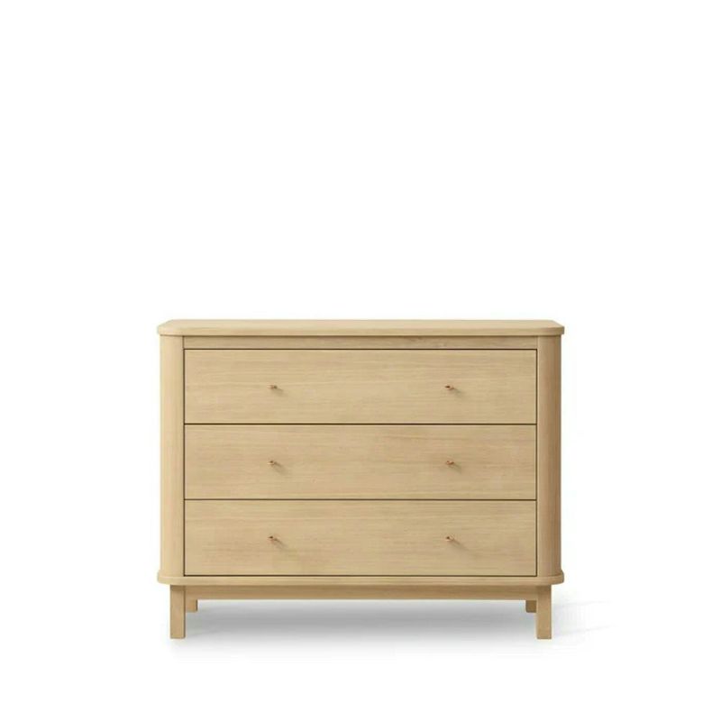 Die Kommode aus Eichenholz strahlt Wärme und natürliche Eleganz aus und ist eine stilvolle und funktionale Ergänzung für das Kinderzimmer. Es ist mit drei geräumigen Schubladen ausgestattet, die jeweils in zwei Fächer unterteilt sind und ausreichend Stauraum für Kleidung, Bettwäsche und Spielsachen bieten. Die Schubladen laufen auf hochwertigen Schienen mit Soft-Close-Funktion, die ein leichtes Gleiten und langsames Schließen gewährleisten. So werden kleine Finger vor Einklemmen geschützt und eine ruhige Atmosphäre geschaffen, in der das Kind ungestört schlafen kann. Die eleganten Tragegriffe aus 100 % Vollnarbenleder unterstreichen das stilvolle Design, während die integrierten Haken an den Seiten für zusätzliche Aufbewahrungsmöglichkeiten ein- und ausgeschoben werden können. Das nordische Design und die hohe Qualität machen die Kommode zu einem eleganten Möbelstück mit langer Lebensdauer.