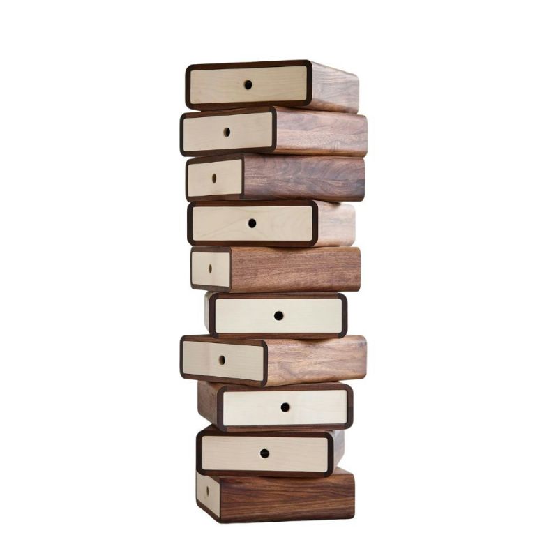Die Aufbewahrungskommode Turning Boxes ist eine Holzkommode mit 10 Schubladen, die sich jeweils um 360 Grad drehen lassen. AK 1020 ist ein skulpturales und dekoratives Möbelstück, das seinen Ausdruck je nach Umgebung verändern kann und zu einem spielerischen Ansatz bei der Wohnraumgestaltung einlädt. So entsteht die Möglichkeit, ein völlig einzigartiges und funktionales Möbel zu schaffen, das genau zu den individuellen Bedürfnissen passt.