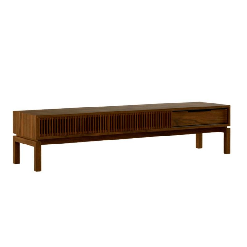 Das TV-Board AK 2020 vereint ein stilreines Design mit praktischer Funktion. Schiebetüren mit Audio-Textil ermöglichen die Bedienung von Geräten per Fernbedienung, während Kabel und Elektronik elegant hinter dem schlichten Ausdruck verborgen bleiben. Der massive Holzsockel hebt den Bildschirm auf die optimale Höhe und macht das Möbel leicht zu bewegen, sodass du die Einrichtung ganz einfach anpassen kannst.