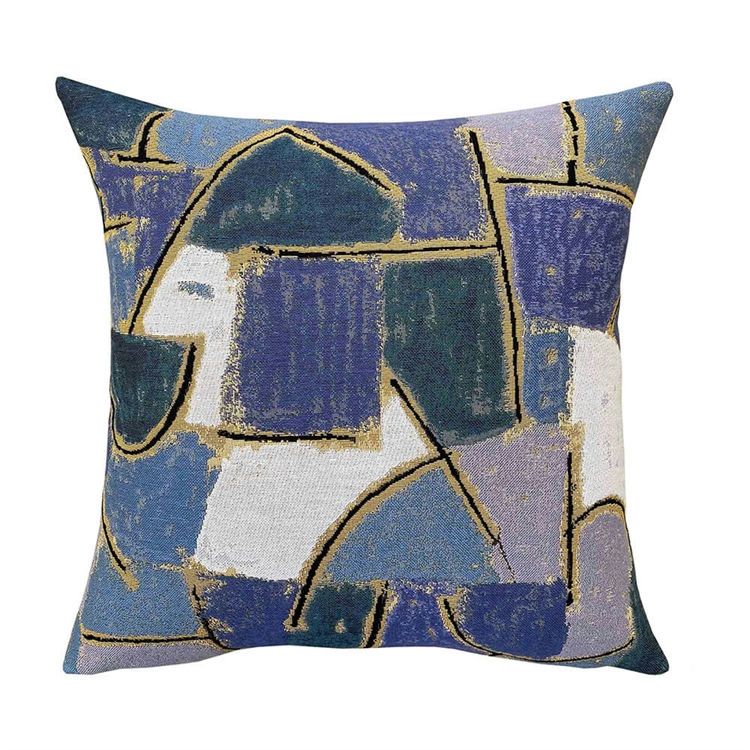 Poulin Design hat in Zusammenarbeit mit der renommierten französischen Weberei Jules Pansu dieses wunderschöne Kissen in gedeckten Blautönen hergestellt. Das Kissen ist in exklusiver Qualität mit einem kubistischen Werk von Paul Klee gewebt.