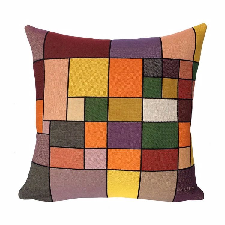 Das wunderschöne gewebte Kissen von Poulin Design von Paul Klee verwendet quadratische und rechteckige Motive in verschiedenen Farben. Das Kissen ist nach Paul Klees wunderschönem Gemälde Harmonie De La Flore Nordique gestaltet, einem von Klees wunderschönen Kunstwerken aus dem Jahr 1927.