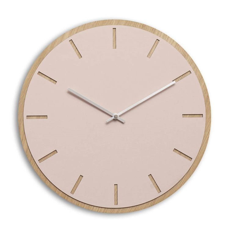 Die Wanduhr Powder aus Eichenholz von Hemverk hat einen femininen und hellen Ausdruck, der dem Interieur einen angenehmen, minimalistischen und nordischen Look verleiht. Die Wanduhr besteht aus hellem Eichenfurnier mit einer Linoleumoberfläche in zartem Rosa, was ihr eine verspielte und dekorative Optik verleiht.