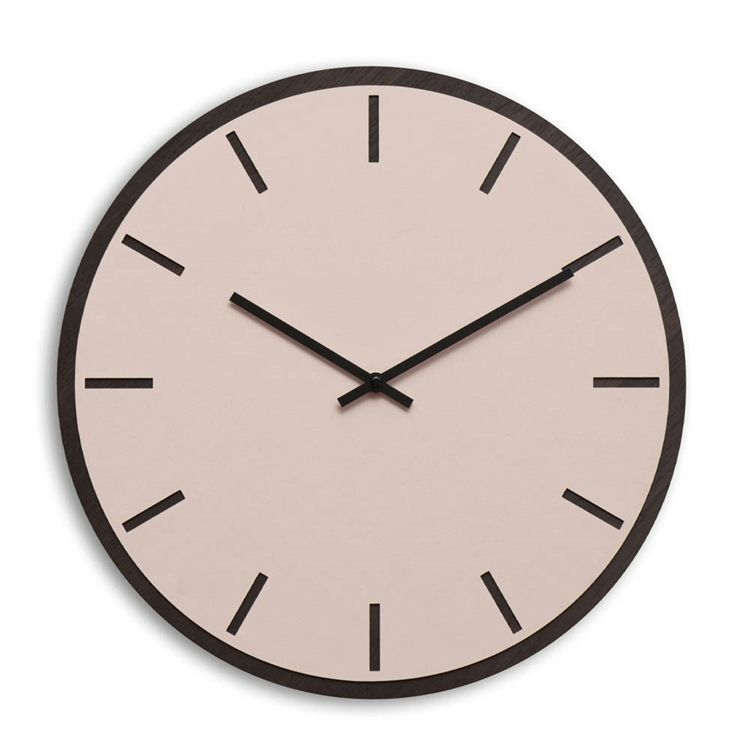 Die Wanduhr von Hemverk in dunklem Eichenfurnier mit einer dekorativen Linoleumscheibe in Puder, die für einen schönen Kontrast sorgt. Die Uhr verfügt über ein komfortables und leises Uhrwerk, was sie in allen Räumen vom Schlafzimmer bis zum Wohnzimmer äußerst nützlich macht.